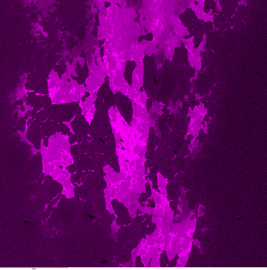 EDS map showing the distribution of Ca in a sample of Anita Bay peridotite. Brightest areas are melt and cpx, darker grains are Ca-rich opx. Olivine is darkest. Field of view: 1 mm