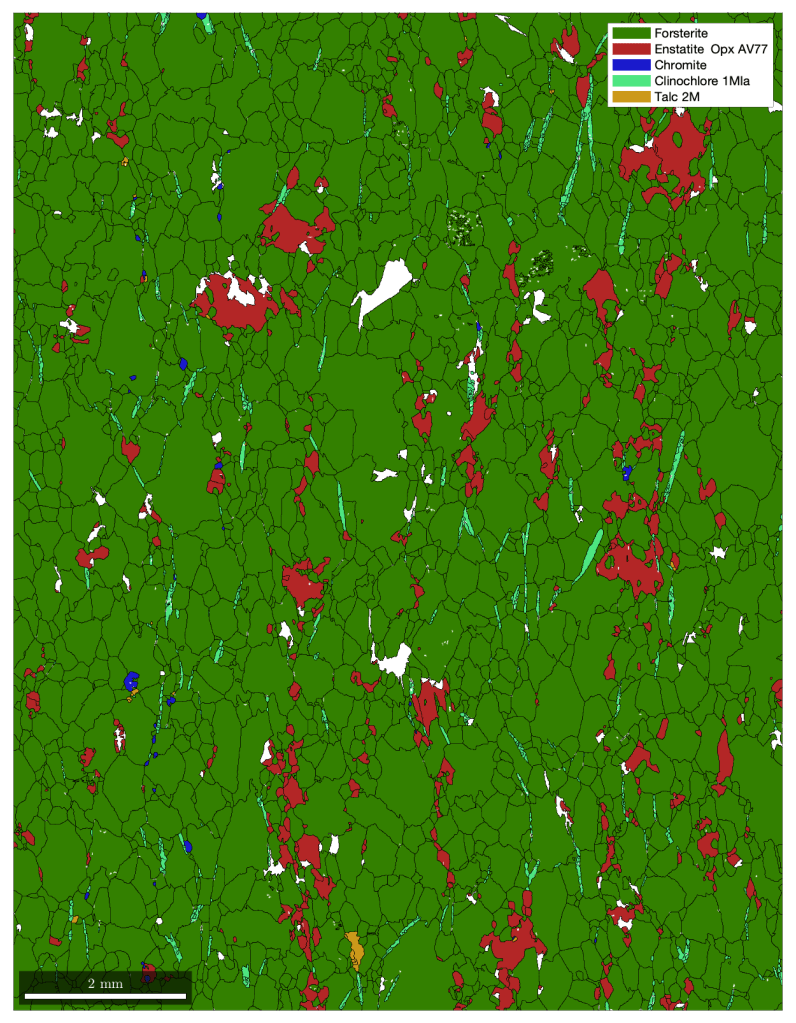Phase map of a sample of Aheim dunite after processing of the raw data with MTEX. White areas are not indexed.