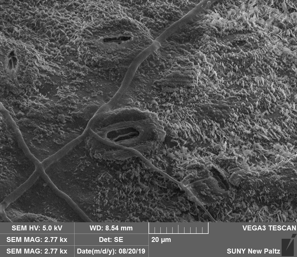 Stomata on a freshly picked oak leaf. Images were taken under high vacuum with sample as is.